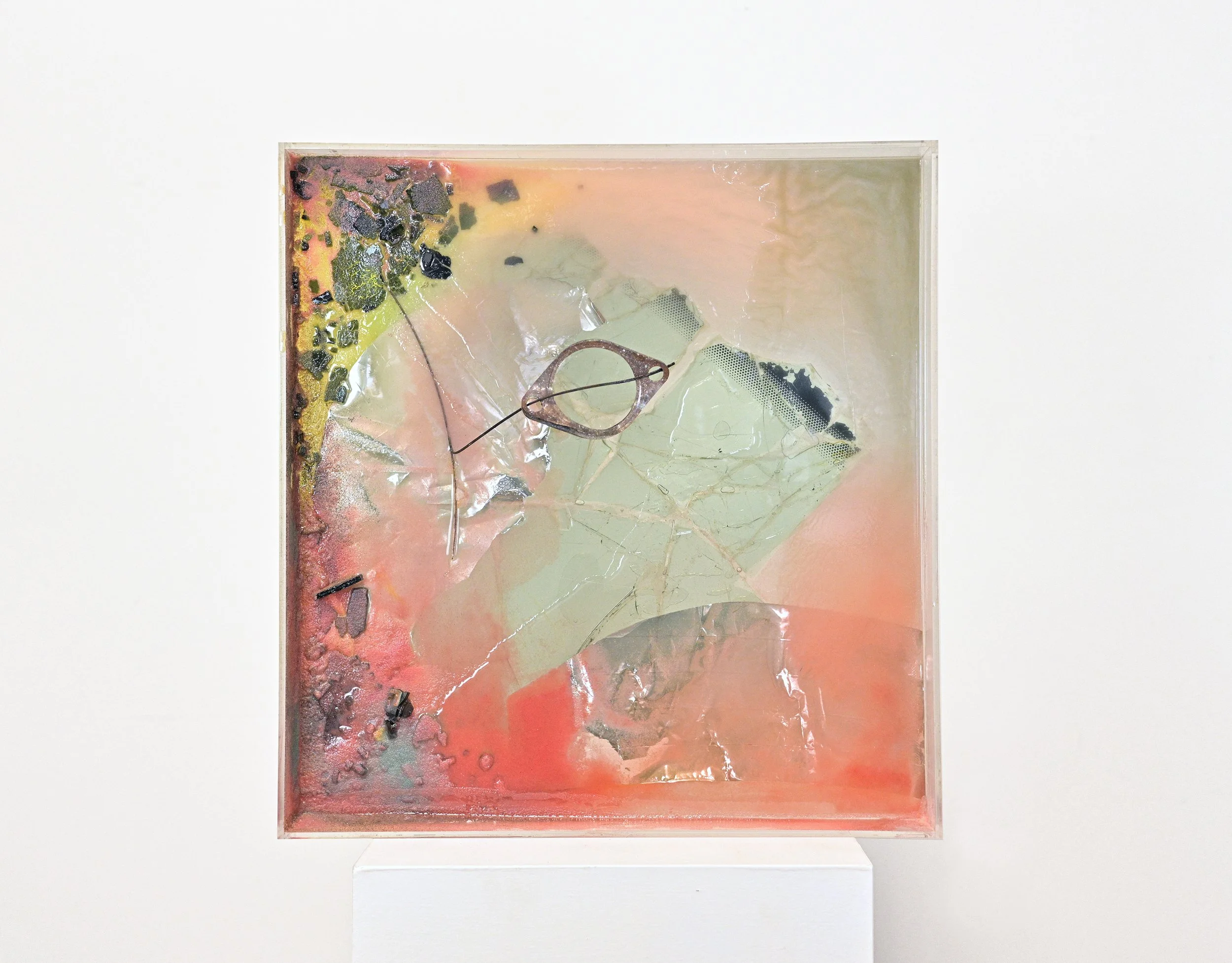 Untitled, Salvaged double-layered windshield glass, auto parts and resin in lexan, 13 ¾” x 11 ¾” x 3 ¼” ,2022